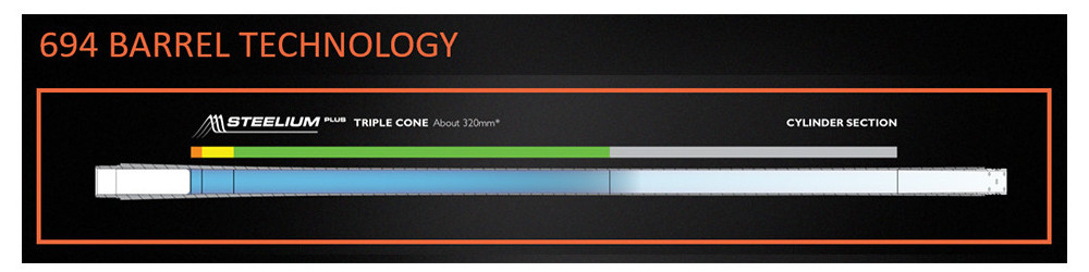 Dzięki unikalnemu procesowi produkcyjnemu luf Steelium, trójstopowa stal Beretta staje się prawdziwym balistycznym klejnotem. Głębokie wercenie, kucie na zimno i rozciągania próżniowe zapewniają stali właściwości mechaniczne, które są idealne, gdy koniecznie jest osiągnięcie doskonałych parametrów balistycznych. Lufy Steelium Plus mają wewnętrzny profil rurowy z bardzo wydłużonym, progresywnym stożkiem , który zmienia się wraz z długością lufy. Zalety? Gęstsze i bardziej równomierne rozłożenie śrutu, szybszy i dokładniejszy drugi strzał i zmniejszenie odczuwalnego podrzutu lufy. Lufy mają komorę 70mm dla wersji Trap i 76mm dla prezentowanej wersji Sporting oraz są dostępne w długościach 71 cm, 76 cm oraz 81cm.