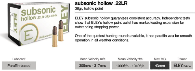 ELEY w wersji SUBSONIC HOLLOW POINT (HP) jest amunicją o zmniejszonej prędkości a co za tym idzie cichszym wystrzale. Zaprojektowana została z myślą o wykorzystaniu w myślistwie, w krajach gdzie amunicja .22 LR jest dopuszczona do polowań.