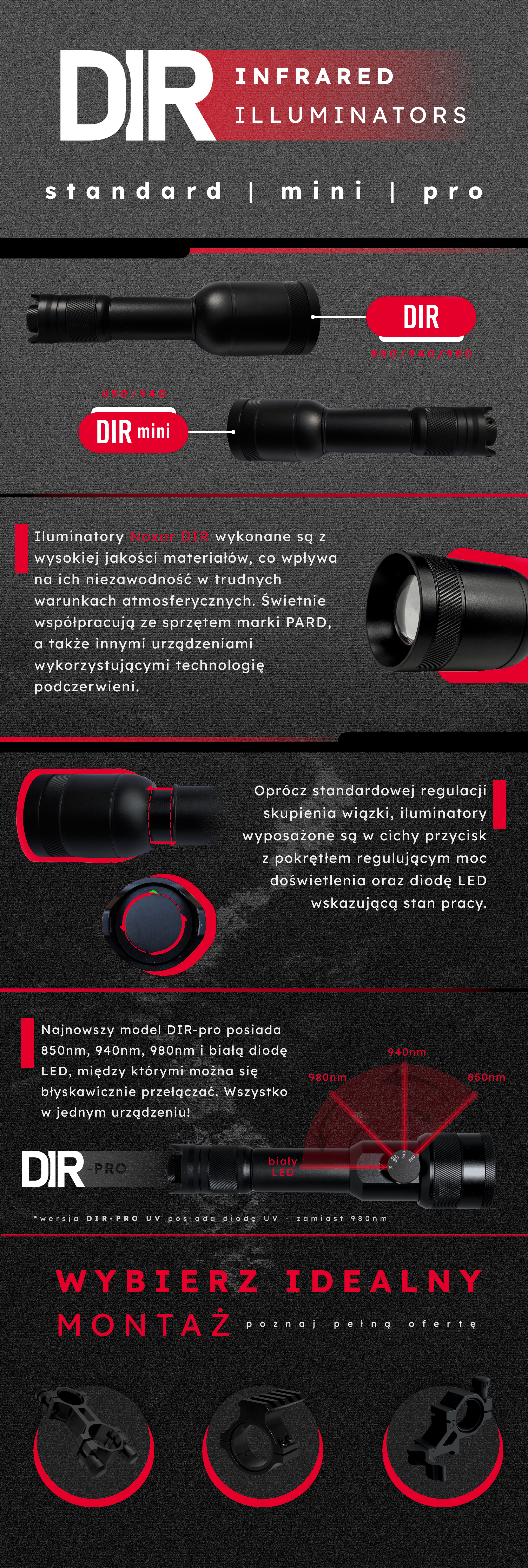 Iluminator NOXAR DIR850 wykonano z wysokiej jakości materiałów, co wpływa na niezawodność pracy w terenie. Świetnie współpracuje z większością cyfrowej noktowizji myśliwskiej dostępnej na polskim rynku, jak np. urządzenia PARD.
