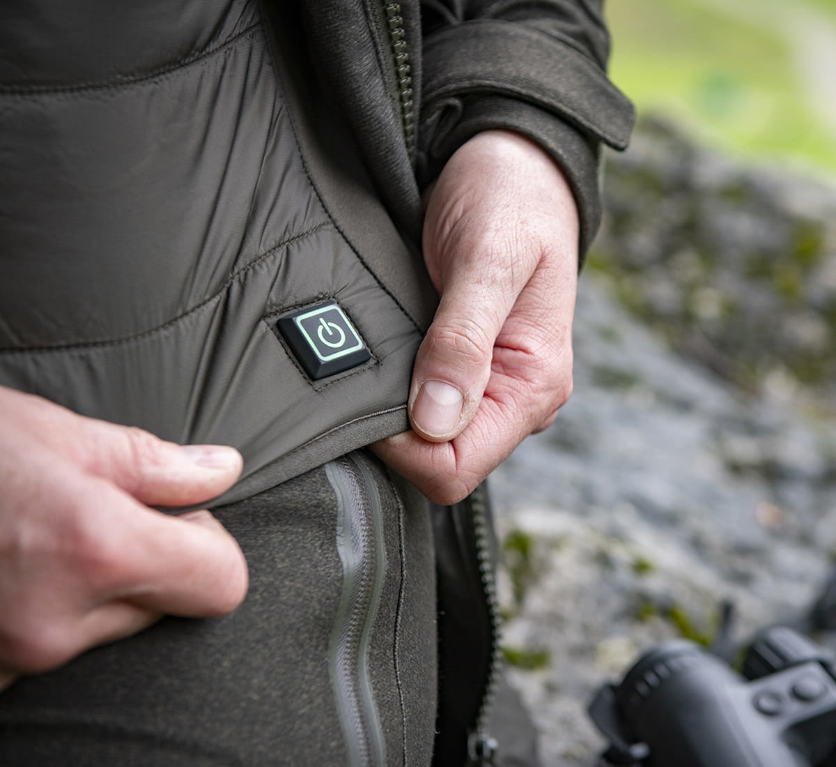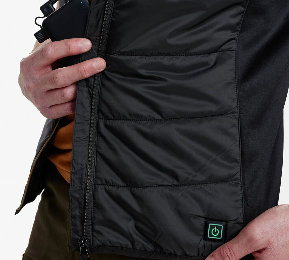 Kamizelka Deerhunter Heat wyposażona jest w zintegrowany system ogrzewania HEAT, który można łatwo aktywować jednym kliknięciem po lewej stronie kamizelki.
