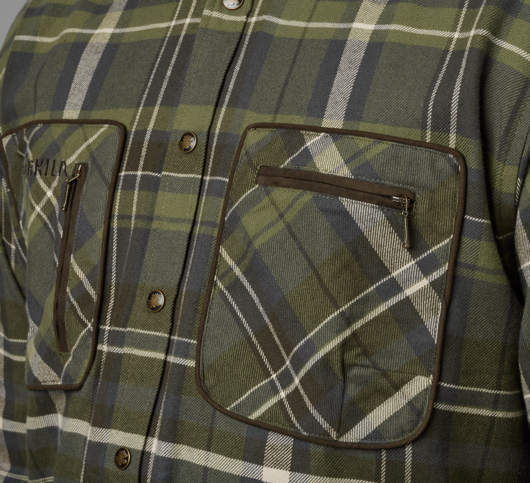 Koszula Härkila Pajala została wykonana w 100% z miękkiej, flanelowej bawełny z mocnymi wzmocnieniami z mikrozamszu w najbardziej eksponowanych miejscach – przy kołnierzu, łokciach i mankietach. Koszula ma zapięcia na zatrzaski i dwie, obszerne kieszenie na piersi po obu stronach – jedną z zamkiem pionowym i jedną z zamkiem poziomym.