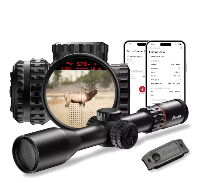 • Kompensacja balistyczna – Rozwiązania balistyczne Eliminatora 6 tworzone są na podstawie danych użytkownika przesłanych za pomocą aplikacji BurrisConnect. Łączność Bluetooth między lunetą a urządzeniem mobilnym użytkownika umożliwia utworzenie wewnętrznej karty DOPE w Eliminator 6, łączącej dane dotyczące zasięgu, środowiska i balistyki, aby uzyskać idealny strzał. Użytkownicy mogą tworzyć profile przy użyciu danych dotyczących fabrycznej amunicji lub całkowicie je dostosowywać. Rozwiązanie to obejmuje szeroki zakres broni palnej, począwszy od broni ładowanej odprzodowo i strzelby śrutowe po precyzyjne karabiny długodystansowe.
