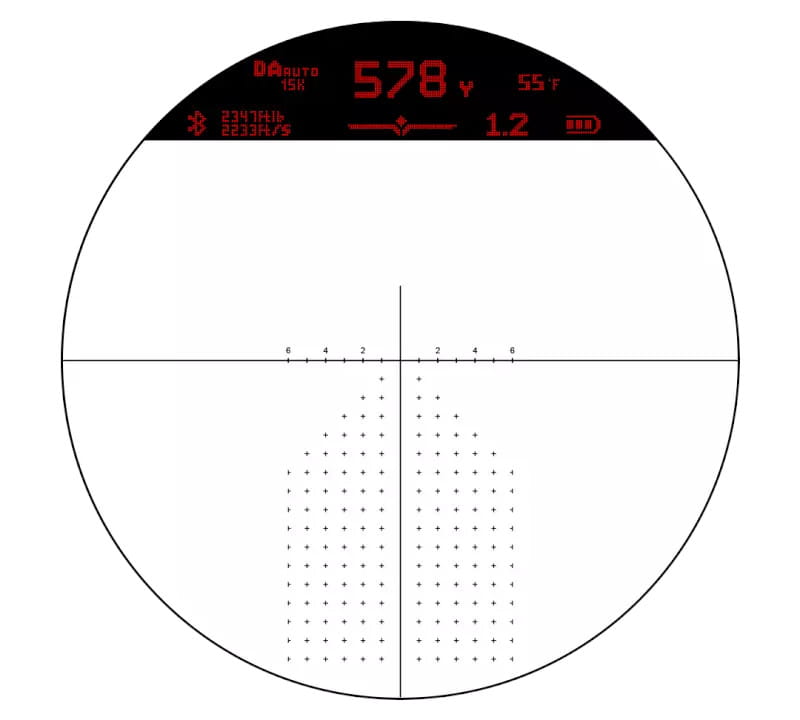 • Kompleksowy interfejs użytkownika – Eliminator 6 prezentuje aż do 10 punktów danych jednocześnie w HUD lunety. Informacje te są podzielone na strefy, które można dowolnie włączać lub wyłączać według preferencji strzelca za pomocą aplikacji Burris Connect. Odległość i parametry wiatru można również dowolnie edytować.