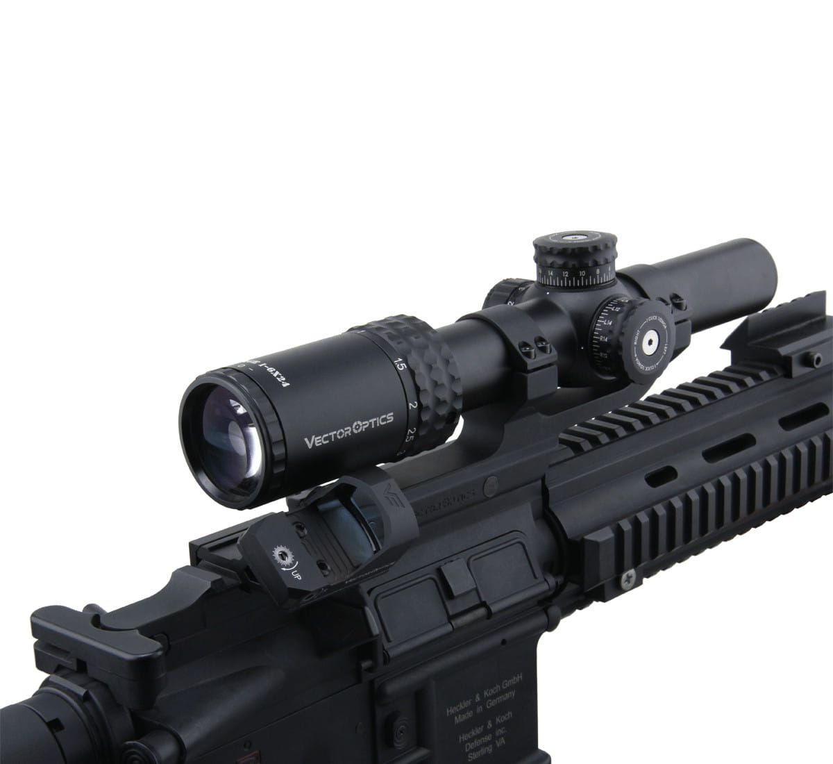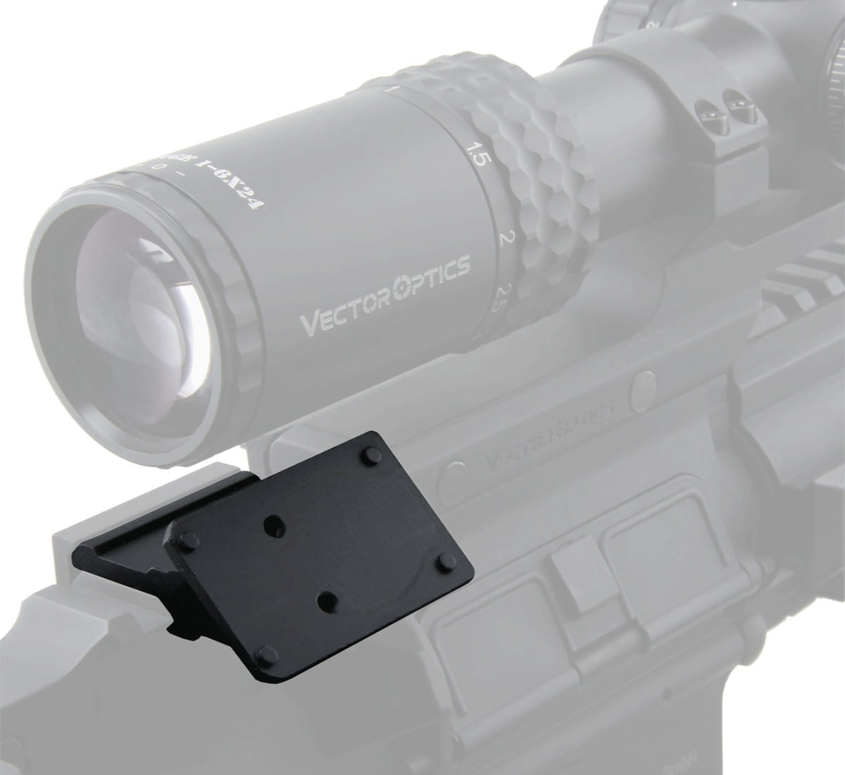 Montaż offsetowy umożliwiający zamocowanie kolimatora Vector Optics Frenzy z rozstawem śrub w standardzie VECTOR MAG na karabinku platformy AR-15.