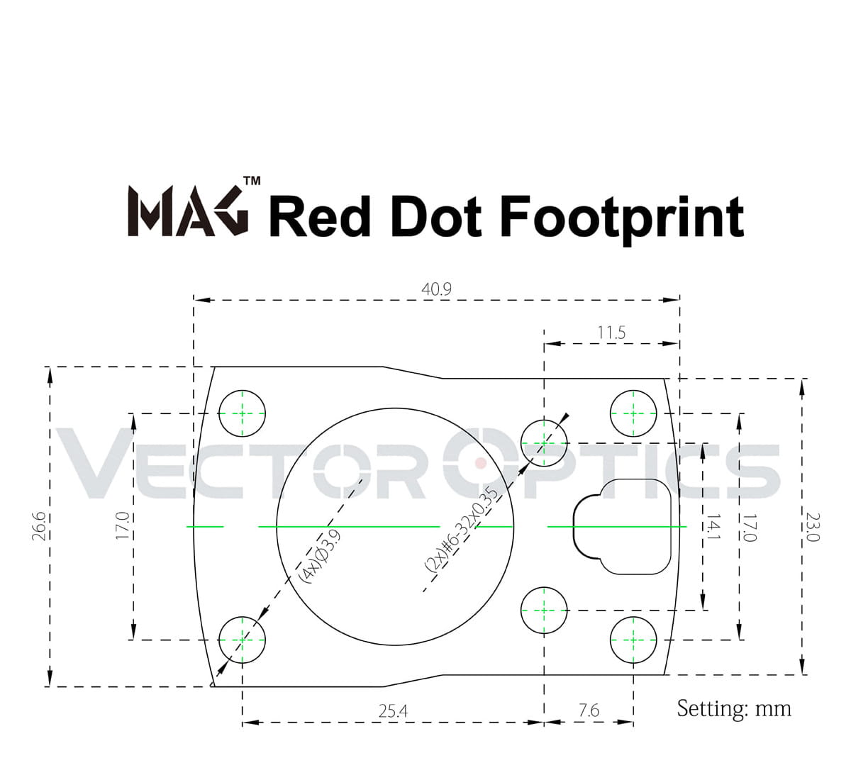 UWAGA! Standard VECTOR MAG posiada rozstaw otworów montażowych (footprint) jak RMSc Shield, przez co montaż może pasować do kolimatorów innych producentów wykonanych w tym standardzie. W razie wątpliwości prosimy odwołać się do schematu i zamieszczonych wymiarów.