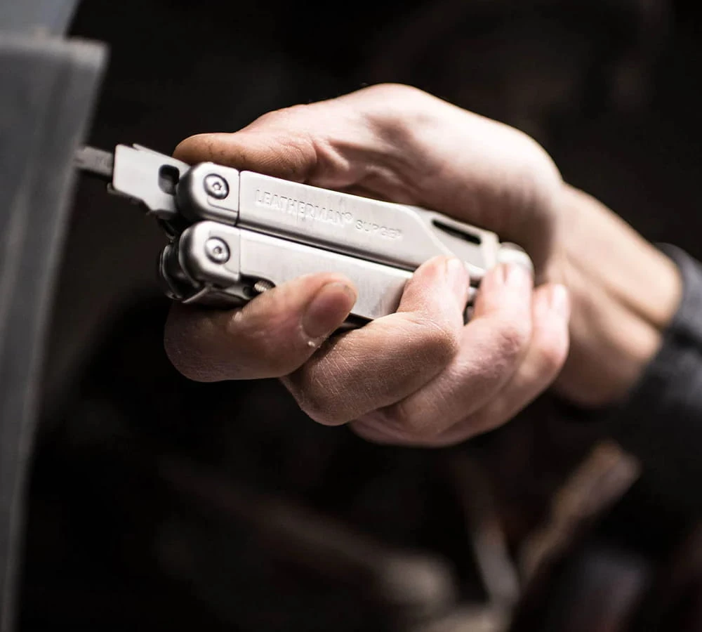 Funkcja pełnej blokady – Funkcja pełnej blokady oznacza, że każde narzędzie oraz nóż na rękojeści, za wyjątkiem głowicy kombinerek, zostanie zablokowane we właściwej, bezpiecznej pozycji. Konstrukcja z pełną blokadą umożliwia użytkownikowi obsługę poszczególnych narzędzi w sposób bezpieczny i efektywny. Blokując narzędzie we właściwej pozycji gdy jest całkowicie rozłożone, użytkownik może wywierać nacisk na przyrząd, jednocześnie bezpiecznie wykonując pracę przed złożeniem.