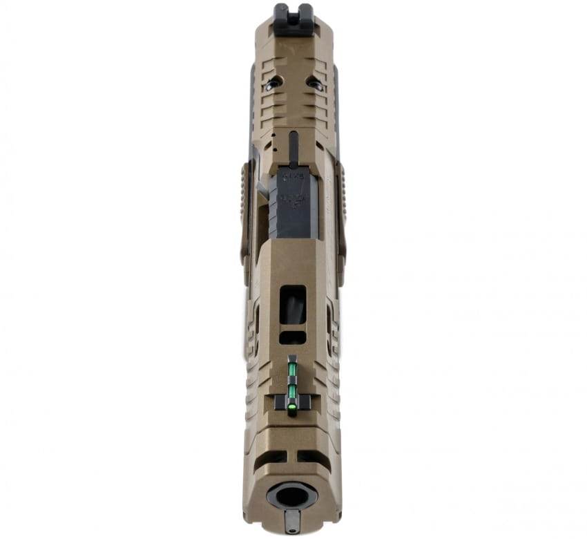 Pistolet ma podwyższone metalowe przyrządy celownicze, w tym światłowodową muszkę renomowanej marki HIVIZ, zapewniającą intuicyjne celowanie. Fabryczne frezowanie zamka pozwala na łatwy montaż optyki w postaci kolimatora – w zestawie dołączono trzy płytki montażowe, kompatybilne z popularnymi kolimatorami, takimi jak: RMS Shield, Sig Romeo Zero, Mecanik M01 i M03. Trijicon SRO czy Holosun 407C.