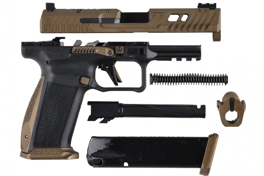 Na pierwszy rzut oka pistolet nie różni się dramatycznie od innych konstrukcji od CANIK’a jak chociażby model RIVAL, natomiast jak to zwykle bywa, diabeł tkwi w szczegółach. Już przy bliższym przyjrzeniu się pistoletowi widać i czuć rękę Tarana, który całkowicie przeprojektował polimerowy szkielet jak i zamek. Agresywniejsze wcięcia w zamku przekładają się na lepsze operowanie bronią w rękawicy a nowa tekstura chwytu jeszcze bardziej poprawia komfort użytkowania. Nowy, obustronny zrzut zamka z karbowaniem, zapewnia wygodną obsługę zarówno dla strzelców prawo-, jak i leworęcznych. Zrzut magazynka może być także z powodzeniem przełożony na drugą stronę. Stylowe otwory wentylacyjne na zamku podkreślają dynamiczny charakter pistoletu i jednocześnie eksponują spiralnie żłobioną lufę. Lufa o długości 4,7” jest zakończona pierwszym w historii marki kompensatorem, który skutecznie redukuje odrzut i podrzut broni, umożliwiając szybsze i bardziej precyzyjne strzelanie.