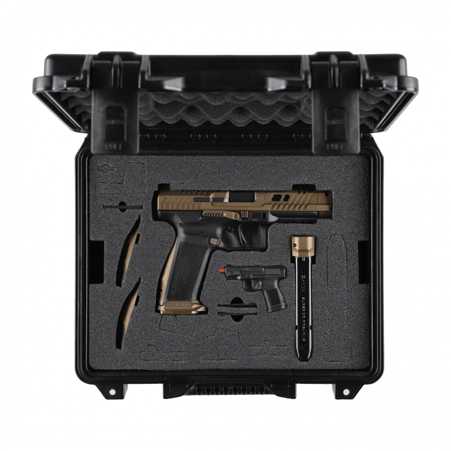 • walizka PCV, 1x magazynek 18nb, 1x magazynek 18+3nb, polimerowa kabura retencyjna (HFL), wymienne nakładki chwytu, 3x płytki montażowe pod różne interfejsy kolimatorów, szybkoładowarka, sprężyna Canik TTI Recoil Spring, wyciory do czyszczenia, moneta kolekcjonerska od TTI, klucz, przybornik z akcesoriami do serwisu pistoletuinstrukcja (ANG)