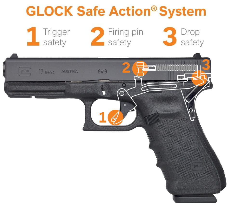 • System spustu SAS (Safe Action System) – Trzy niezależne od siebie stopnie bezpieczeństwa rozłączają się sekwencyjnie, gdy spust jest pociągany i automatycznie ulegają włączeniu po jego zwolnieniu.
