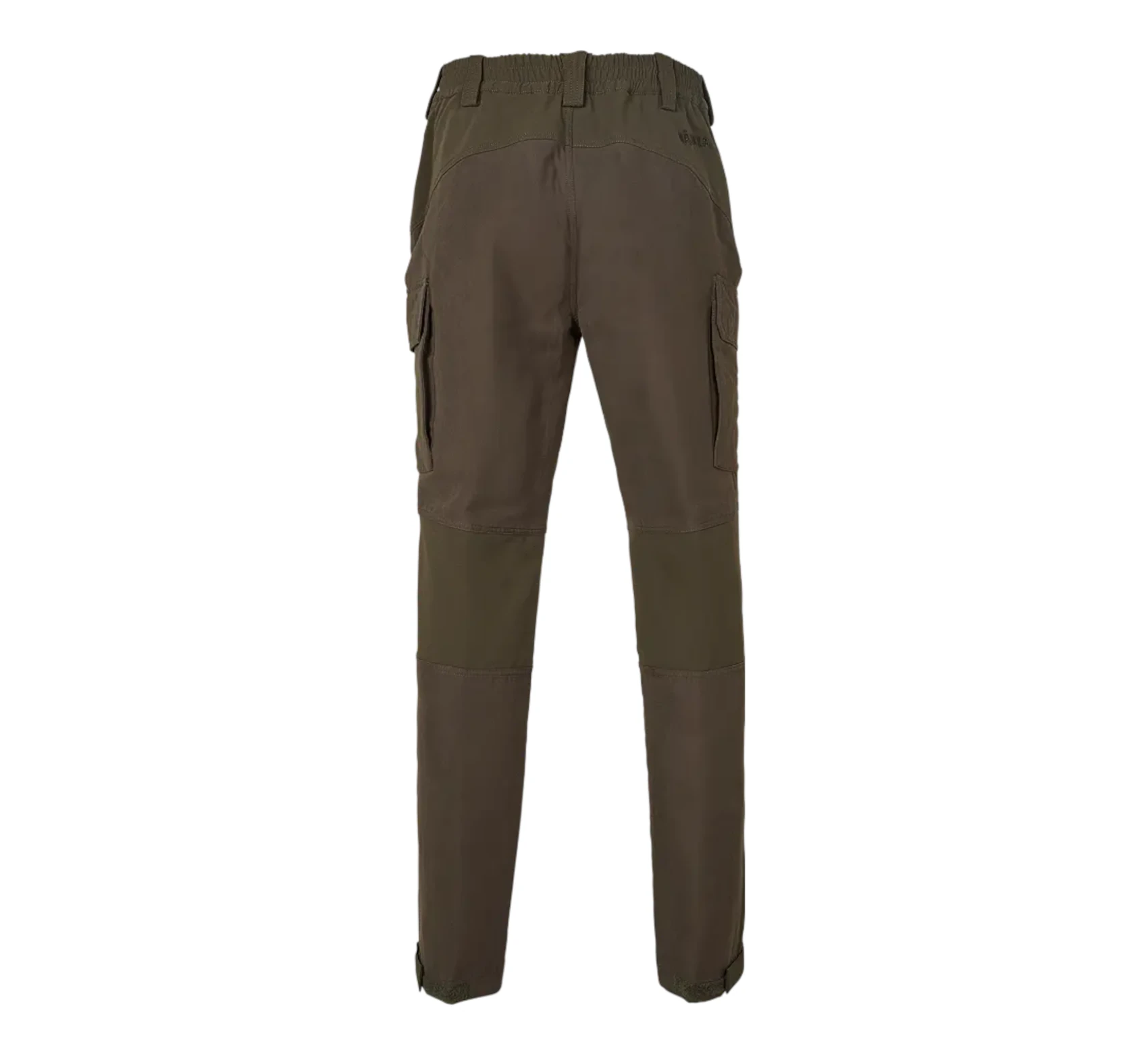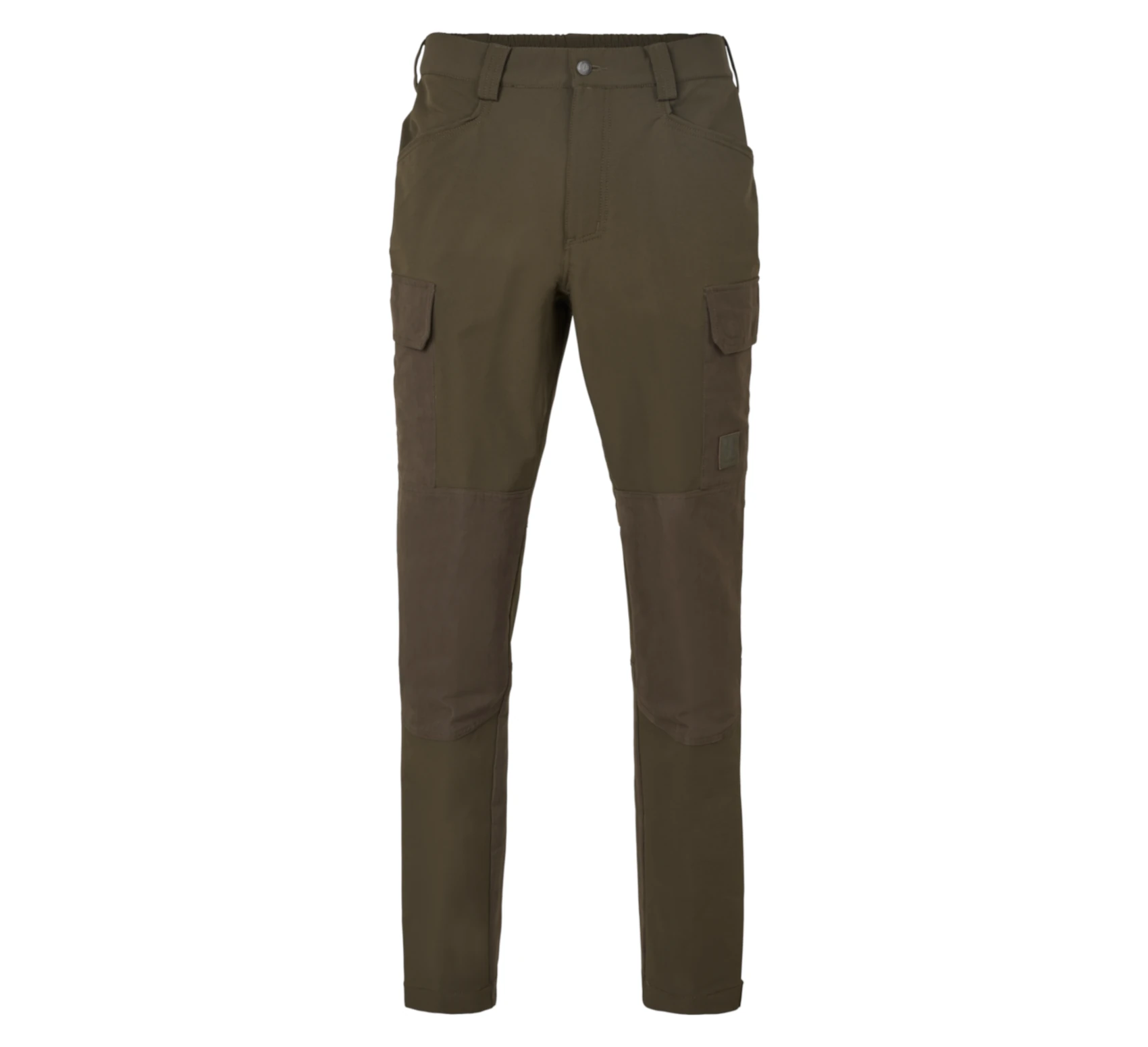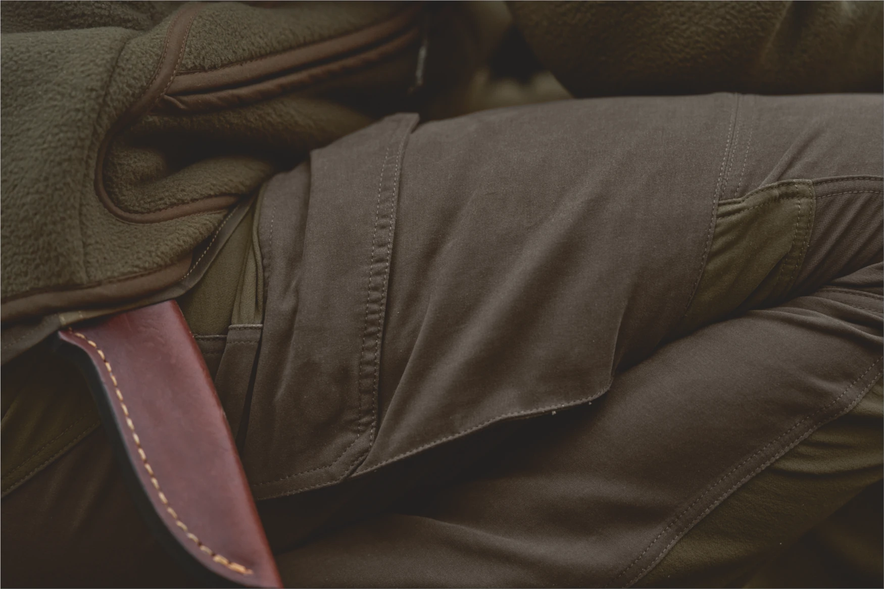 Łatwo dostępne kieszenie górne i kieszenie na udach z ochronnymi klapkami zabezpieczonymi cichymi zapięciami magnetycznymi to praktyczne rozwiązania tego modelu niwelujące hałas podczas polowań. Dodatkowo, w prawej kieszeni na udzie znajduje się uchwyt na nabój. Skórzana metka z logo oraz zastosowane połączenia kolorystyczne dodają spodniom eleganckiego charakteru.
