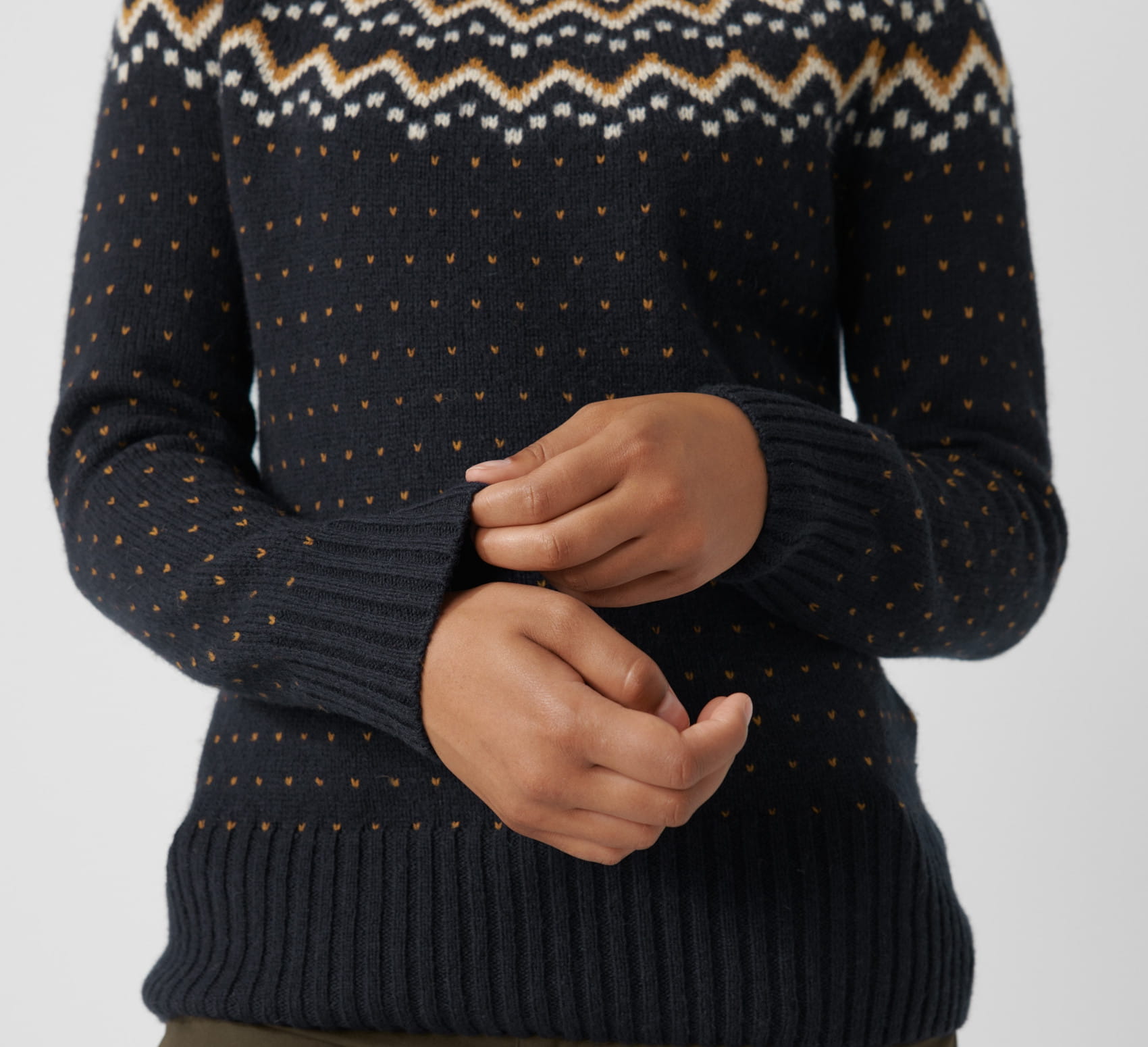 Model Övik to sweter w piękne wzory, który zachwyca również swoją funkcjonalnością, ponieważ wełna odprowadza wilgoć z podstawowych warstw odzieży i jest jednym z niewielu włókien, które ogrzewają nawet wtedy, gdy są wilgotne. Doskonały jako izolująca warstwa pośrednia (Mid layer) pod kurtkę typu hard shell, a w nieco cieplejsze dni pod kamizelkę puchową. Okrągły dekolt i raglanowe rękawy ze wzmocnieniami na łokciach. Prążkowane brzegi mankietów i brzegu dolnego.