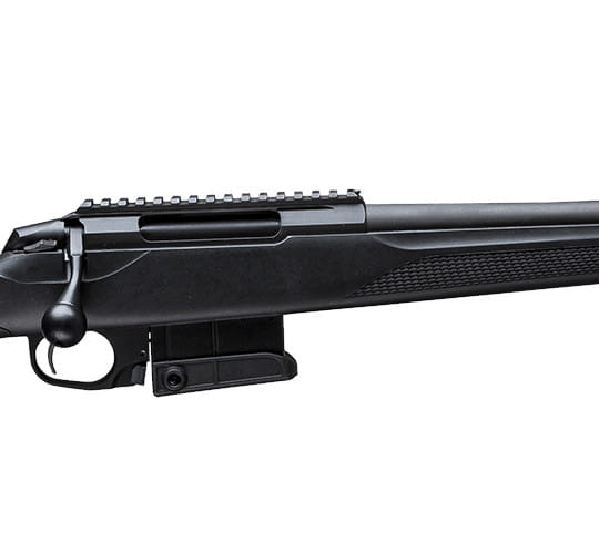 • Zamek: Tikka T3x to klasyczny repetier z zamkiem obrotowo ślizgowym wyposażonym w dwa solidne rygle. Kąt otwarcia zamka wynosi 70 stopni, co ułatwia montaż lunety na niskiej podstawie. Zamek pracuje cicho i płynnie, bez oporów, a ergonomicznie ulokowana rączka sprawia, że jego obsługa jest łatwa i wygodna.