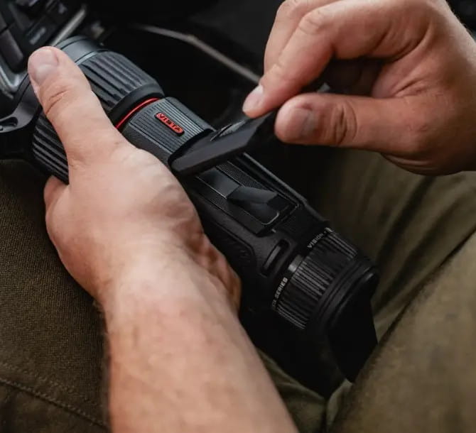 Obudowa Nocpix VISTA charakteryzuje się wysoką ergonomią i przemyślanym designem. Przemyślany projekt termowizora widoczny jest na każdym kroku. Przykładem mogą być np. ultra-ciche przyciski, które zapewniają pełną dyskrecję podczas użytkowania w terenie. Obudowa całkowicie pokryta teksturą z TPU imitującego skórę, zapewnia wygodny chwyt, co ułatwia długotrwałe użytkowanie.