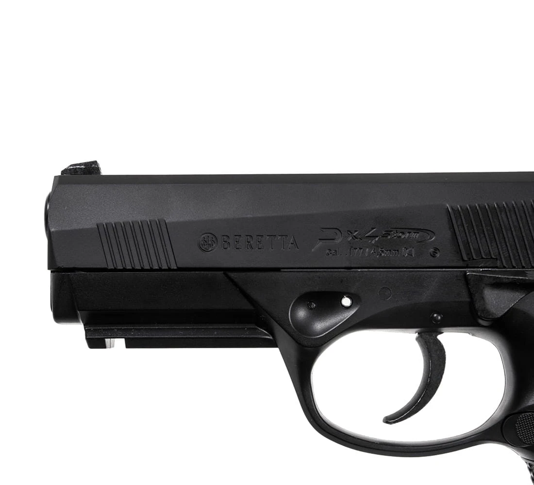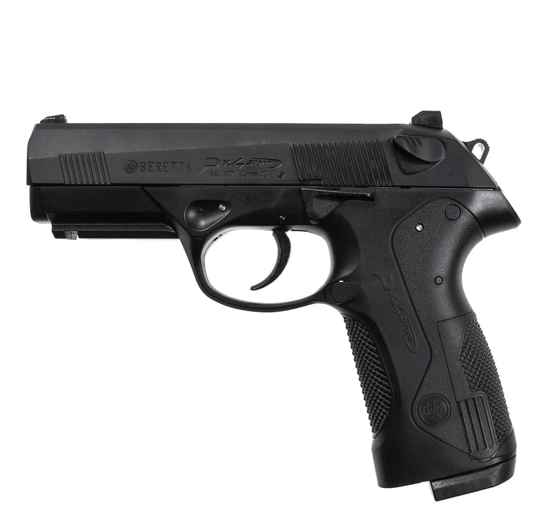 Beretta Px4 Storm 4,5mm to nowoczesny pistolet wiatrówkowy strzelający śrutem typu diabolo wyprodukowany przez renomowaną markę Umarex. Replika zasilana jest sprężonym CO2 zmagazynowanym w 12g naboju, którego port znajduje się w chwycie, zaraz za gniazdem magazynka. Zapas gazu wystarcza na oddanie około 60 strzałów z prędkością dochodzącą do 115 m/s